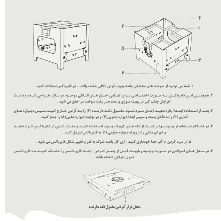 -مناسب برای استفاده در طبیعت یا هر نوع فضای باز -تمام قطعات منقل به هم متصل است و حالت تاشو دارد -دارای صفحه مفتولی -کوچک و سبک -از سوخت های مختلف مانند چوب و یا قرص الکلی جامد و ... میتوان در آن استفاده کرد -دارای کیف پارچه ای جهت حمل آسان -بسیار کم حجم -مقاوم دربرابر حرارت -مقاوم دربرابر ضربه -قابلیت برپایی آسان -مناسب برای هرنوع فضای باز -ساخت ایران