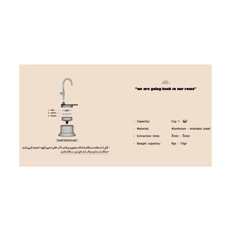 ویژگی ها: -ظرفیت: 1فنجان -حجم مخزن آب: 50 سیسی -حجم مخزن قهوه: 8 تا 10 گرم -مدت زمان عصاره گیری: 5-3 دقیقه -دارای یک عدد لیوان -دارای یک بند چرمی متصل به دستگاه جهت برداشتن از روی حرارت -بدنه مقاوم آنودایز شده که سبب پایین آوردن ضریب انتقال حرارت و جلوگیری از سوختن پودر قهوه میشود. -دارای کاور حمل -محصول ایران